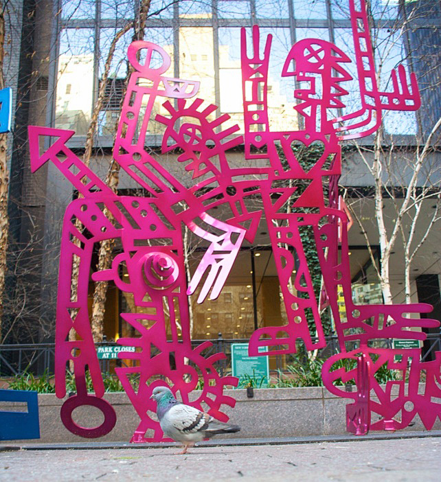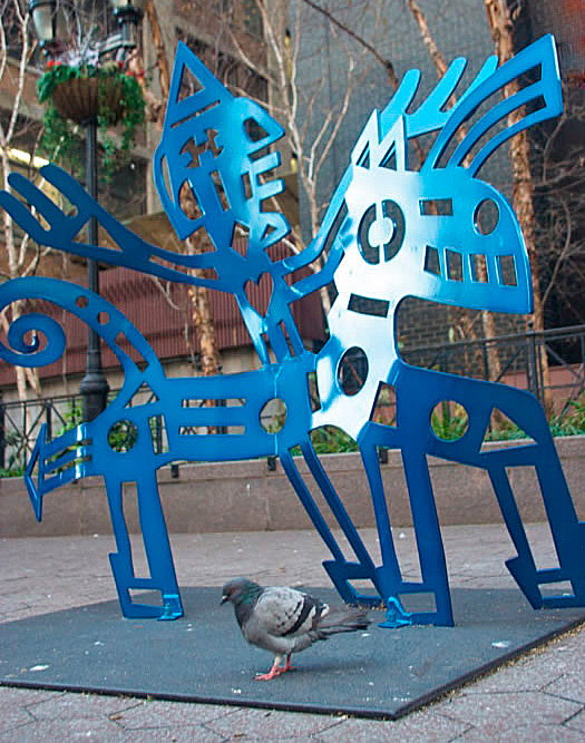 Arrows? Why arrows, was a frequent question asked when people saw my paintings--which was years before I even dreamed of doing sculptures. Indeed these arrows were everywhere. And why? The arrows mean energy moving, I said. You have to say something. Moving through what, they said. Through time, I said. I was making it up. Then I found that The Arrow of Time was a term coined in 1927 by Arthur Eddington, a British astronomer. See the Wikipedia. I was disheartened to learn that at least as far as physics is concerned Eddington's arrow, moving only in one direction is a property of entropy alone--hence the future of our planet was all doom and gloom. Reading further I discovered a more hopeful theory by the Belgian Nobel laureate Ilya Progogine, which shows that in a state of non-equilibrium, order emerges. Non-equilibrium brings order out of chaos. Progogine's Arrow of Time moves in both directions. Here atop the steps of The Dag Hammarskjold Plaza where arrows are shooting out in every direction, the purple king, the blue thinker, and green Mother Earth observe the magenta acrobats. The four pieces in Horsing Around The Arrows Of Time were designed as individual pieces, done purely for fun. They came together to fulfill the needs of the site, the acrobats and horsemen were named Horsing Around, maybe they were at a fair, but later with the inclusion of Mother Earth it became evident there was a story. Who are these acrobats, so zany, so energetic? If they have something to do with the environment--and we can guess that they do, since this is a park, then let us hope that these acrobats will find some energy solutions--perhaps they are modern alchemists who will turn garbage into gasoline. But why are the horsemen throwing up their hands--and where are their legs? Notice that Mother Earth is down on one knee. Is she begging or praying?